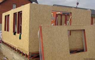- Каркасно-панельная (щитовая) технология. Суть её заключается в том, что на заводе для конкретного дома собираются щиты-панели, которые состоят из нескольких слоев различных изоляторов и утеплителей, обшитых с двух сторон ОСБ-плитами, затем из них уже собирают на строительном участке дом. Т.е. здесь скелет не возводится.